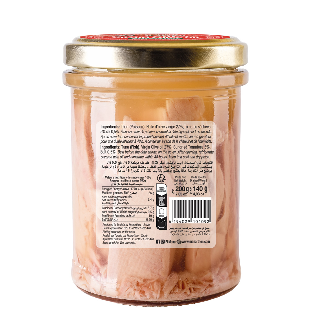 Découvrez les filets de thon El Manar, issus d’une sélection rigoureuse et préparés avec un savoir-faire traditionnel. Délicats et savoureux, ils sont riches en protéines, oméga-3 et nutriments essentiels, pour allier plaisir et équilibre au quotidien.